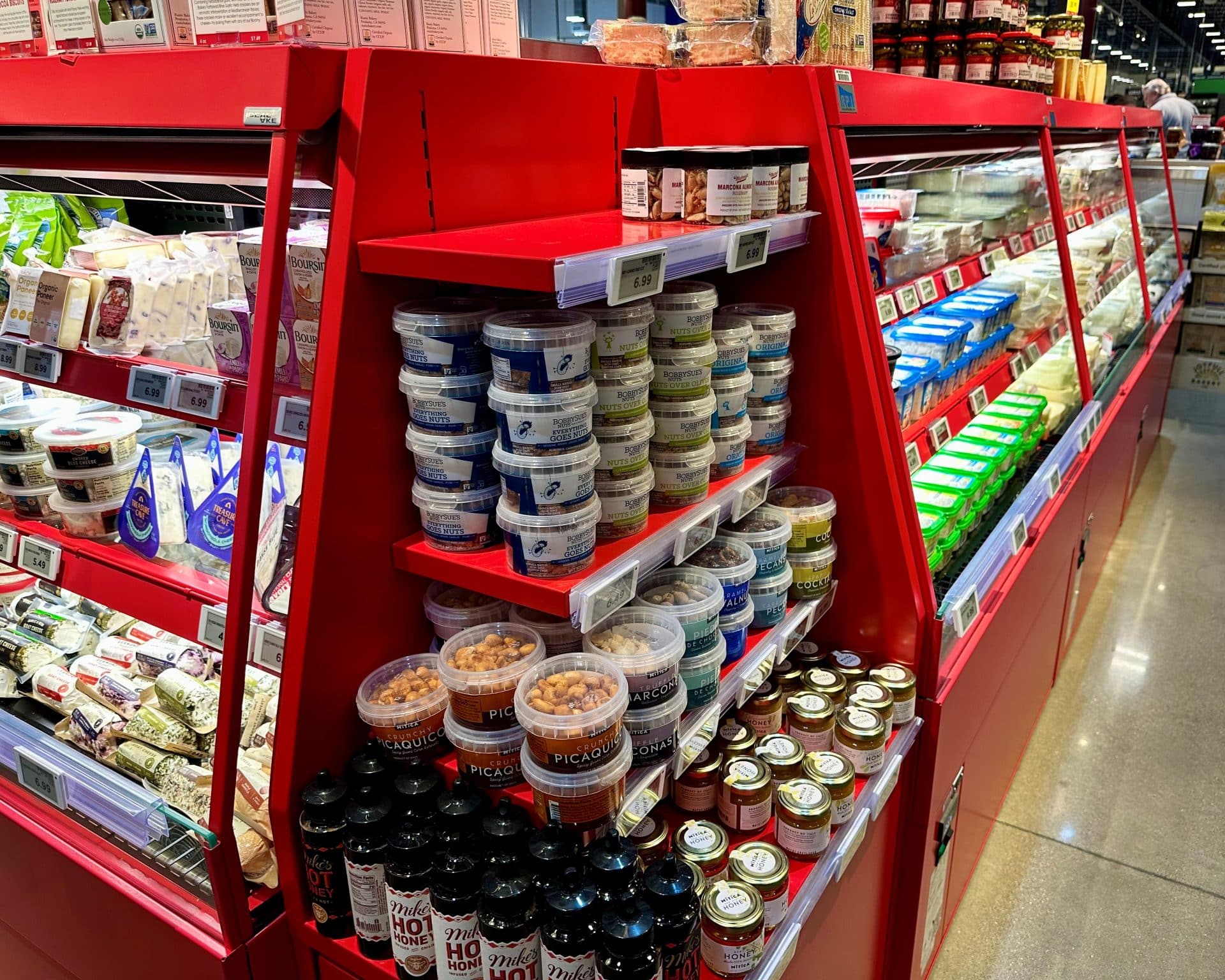 43 Retail Marketplace with Caleo Island Configuration Self-Service Refrigerated Display on Custom Mobile Tables