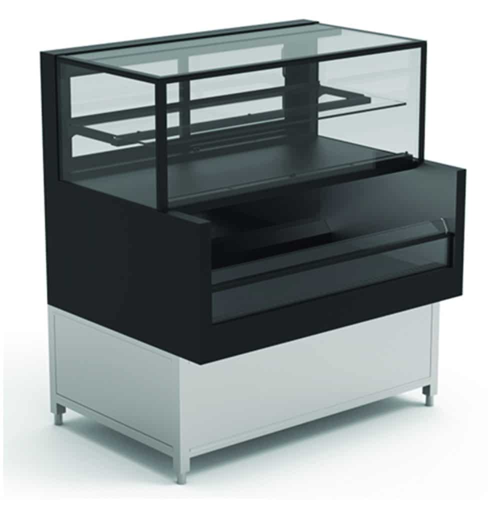 The Vienna Series combination display unit offers an open grab and go refrigerated base with an upper glass full service display enclosure featuring an adjustable baffle that allows an upper section to be used as either ambient or refrigerated display space. The upper display is framed in black with flat double-pane insulated glass.